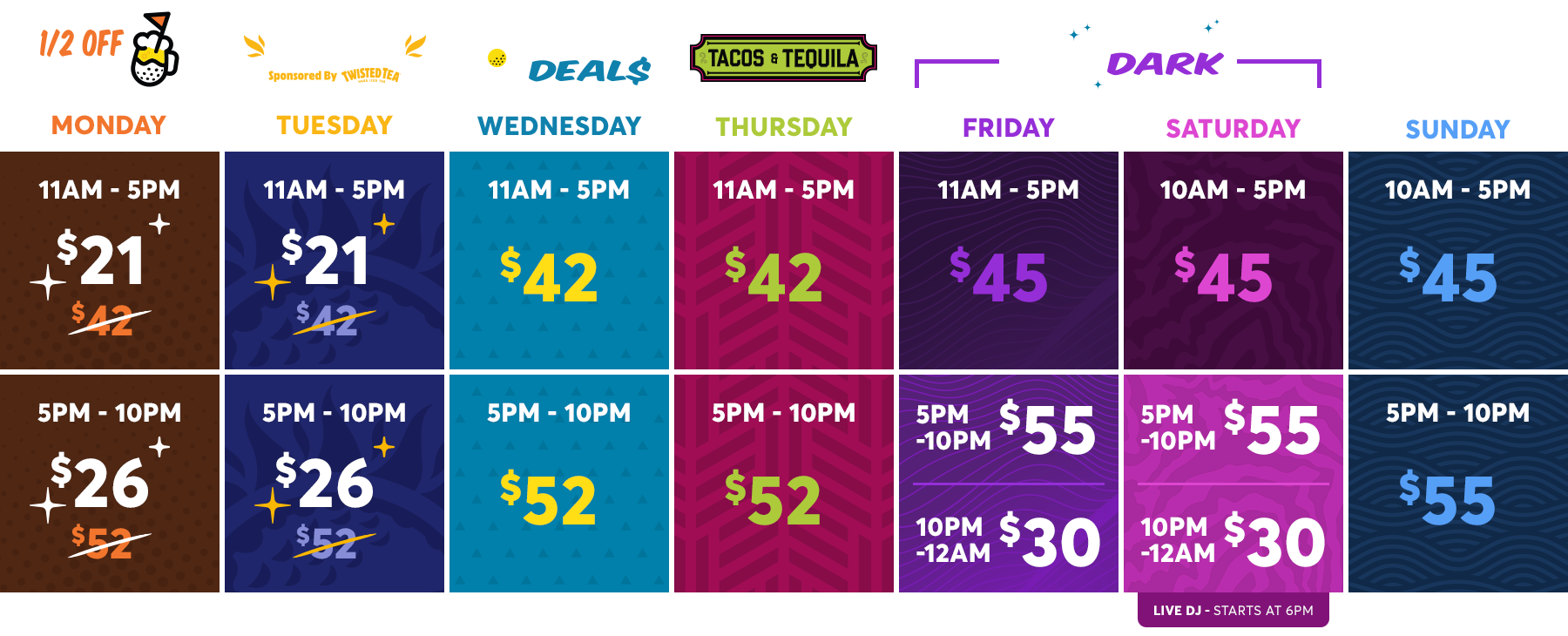 Sneak in some early week play the best way–half off! Every Tuesday, get 50% off gameplay and Twisted Teas.